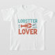 El diseño de la camiseta muestra el texto "Lobster Lover" en una letra lúdica, escrita a mano, rodeada de coloridos y extravagantes ilustraciones con temas de langosta como burbujas, algas y conchas. El diseño general transmite una sensación de diversión y alegría, celebrando el amor por el bogavante y el océano.