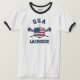 LaCrosse. Diseño del escudo de la bandera con los palillos cruzados. Diseños disponibles en regular y resistidos, versiones del vintage-estilo. Lacrosse de los E.E.U.U. Camisetas, tazas, casquillos, pegatinas y más del lacrosse de Estados Unidos.