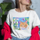 Arte folclórico suntuoso acuarela naranja gato y camiseta con flores azules y moradas. Cita, "Los gatos son mi tribu", contenido generativo.