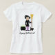 Esta camisa muestra el ilustracion original de Destei personalizado de un lindo chica de brujas de Halloween. La bruja sostiene una escoba y ella tiene un gato negro a sus pies. La bruja tiene un traje negro y sus calcetines son morados y rayados grises. Su cabello es largo y de color gris. También hay un gran hervidor de agua con un líquido burbujeante y verde al lado de la bruja. Bajo la imagen hay un área de texto personalizable que ahora dice "¡Feliz Halloween!".