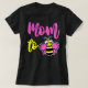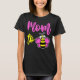 Esta camiseta negra contiene las palabras "Mamá para Abejar" arregladas juguetamente con una linda abeja personalizado. "Mamá" está escrita en escritura rosa, "to" en escritura amarilla, y la abeja tiene alas rosas y rayas amarillas y negras. Es un diseño dulce que probablemente celebra a una futura madre.