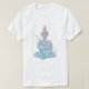 un diseño decorativo de una figura de buddha sentada con un diseño de manala colorido en tonos azul y violeta sobre la silueta de una camiseta