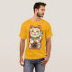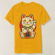 Este vibrante ilustracion presenta un tradicional Maneki Neko japonés, o "Gato Suertudo", representado en un estilo encantador y caprichoso. Se muestra al gato sentado en posición vertical, levantando su pata izquierda en un gesto acogedor que se cree trae buena fortuna y felicidad. El gato tiene una expresión encantadora y alegre, con los ojos anchos y la boca curvada en una sonrisa suave. El Maneki Neko es predominantemente blanco, con manchas de amarillo y rojo, añadiendo un toque animado y colorido al diseño. Lleva puesto un collar verde adornado con una campana de oro, que simboliza la riqueza y la prosperidad. El gato tiene una gran moneda roja con huellas de pata negra, destacando aún más su papel como portador de suerte y buena fortuna. El fondo está formado por un círculo rojo audaz que realza el aspecto alegre y luminoso del gato. El diseño general tiene una textura retro, un poco angustiada, que le da un toque nostálgico e intemporal.