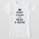 Mantén la calma y lee una camiseta del libro con una corona minimalista. Gran camiseta para los gusanos de biblioteca. *Tenga en cuenta que la marca de agua Zazzle que aparece en la vista previa del zoom NO aparecerá en el producto impreso final. © Tipo de novela