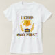 La camiseta de esta mujer exhibe un original y audaz tipo de letra con letras de colores dorados y un contorno azul marino que muestra la frase "Yo mantengo a Dios primero" con un trofeo de primer lugar más un tema floral a cada lado del centro que muestra el nombre de Dios en este tema de la biblia basada en la fe. Esta camiseta presenta un ajuste relajado para la forma hembra hecha de 100% algodón esta camisa es duradera y suave que hacen una gran combinación.