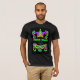 Camiseta masculina para el Mardi Gras con corona, máscara y cuentas en los colores tradicionales - verde, violeta y amarillo dorado, de un collage de papel pintado a mano de Judy Adamson.