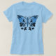 Dos cráneos forman las alas de esta mariposa azul con acentos florales. Este es un diseño de cráneo único que se ve muy bien en ropa de mujer y de niño.