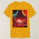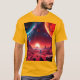 Un astronauta se alza sobre un paisaje foráneo rocoso y rojo bajo un cielo vibrante lleno de planetas y estrellas. La escena es surrealista, con un gran planeta brillante que domina el horizonte.