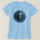 Una gran camiseta de una mujer de ciencia ficción con una escalofriante máscara de robot azul con efecto metálico. El texto dice "Auge del AIN", pero puedes cambiarlo si quieres. Es un guiño en la dirección de cómo la inteligencia artificial podría conducir a un futuro terrible donde las máquinas tienen dominio sobre los humanos.