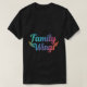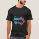 La camiseta muestra el texto "Alas familiares" escrito en múltiples colores, vibrantes, con un fondo borroso.