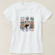 Camiseta de mujer con una mujer de cabello blanco corto y gafas redondas coloridas. Lleva una camiseta con la tipografía "ME ENCANTA CREAR ARTE DIGITAL", leggings y zapatos de croc morado con medias impresas. Está sentada en una mesa en un desordenado estudio de arte rodeado de suministros de arte