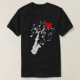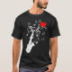 Imágenes de silueta de un instrumento musical saxofón, una nube de notas y arcos y una imagen de un pequeño corazón rojo. Fondo negro u oscuro. Camiseta divertida para hombres. Para los amantes de la música, el jazz y las melodías saxofónicas.