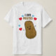 Divertidos y felices papas marrones rodeados de corazones de amor rojos y azules con Amo a las papas con letras negras y marrones encima de su cabeza.