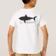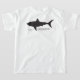 Ilustracion de color del tiburón gigante Megalodon en el frente, silueta blanco y negro en la parte posterior.