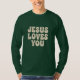 A comfortable long sleeve shirt with a strong design, perfect for daily wear or religious events. The message "Jesus Loves You" is printed in cream/beige bubble letters, reminiscent of 70s retro style. Ideal for expressing faith, youth groups, or as an inspirational gift.