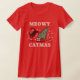 Ilustracion de estilo retro con diseño de texto "Meowy Catmas" y lindo gato negro, árbol de Navidad, copos de nieve, regalos, patas y estrellas decoración