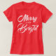 festive Christmas graphic tee for women featuring modern lowercase script typography with "Merry and Bright" saying. White text and red tshirt style can both be modified.
