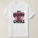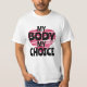 Diseño de texto con la cita "Mi cuerpo, mi elección". Defender la dignidad humana, la igualdad de género, los derechos de la mujer y la autodeterminación.