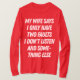 "Mi esposa dice que solamente tengo dos defectos, no escucho y algo más" Un regalo gracioso para su marido Esta graciosa camiseta es el regalo perfecto para el esposo que siempre está en un poco de problemas. Con un ingenioso diseño que se burla del clásico chiste del marido, esta camisa seguramente le dará una sonrisa a la cara a cualquiera. Características principales: Diseño humorístico: una cita divertida y relativa para cualquier pareja. Material de alta calidad: hecho con tela suave y cómoda. Regalo perfecto: Ideal para cumpleaños, aniversarios, vacaciones o simplemente porque. ¡Ordene la suya hoy y deje que empiece la risa!