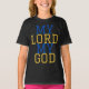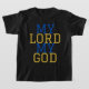 Esta camiseta del chica muestra las palabras "Mi Señor, Dios" en negrita con letras de colores azules y dorados en un estilo tipográfico y un tema basado en la fe. Esta camiseta presenta un ajuste relajado para la forma hembra hecha de 100% algodón esta camisa es duradera y suave que hacen una gran combinación.