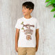 Un mono colgando de su cola sosteniendo una pelota de fútbol. Este diseño se ve realmente efectivo en esta camiseta para niños