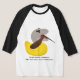 Un pato amarillo de goma con la cabeza T-Rex, y un timón y timón en la boca, dice, "Envíen más campistas. Los últimos estaban deliciosos".