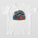 Camión de monstruo conduciendo a través del barro. Camiseta colorida para niños. Unisex.