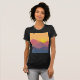 Una camiseta con un ilustracion gráfico con muchas cumbres montañosas con luz amarillo brillante detrás de las montañas. Fabricado con formas geométricas poligonales.Diseño minimalista simple. Los colores van desde el azul oscuro hasta el rojo desierto.