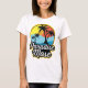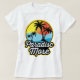 Este llamativo logo circular presenta una vibrante escena de atardecer tropical inspirada en la retro enmarcada por un audaz borde amarillo. Dentro del círculo, siluetas de tres palmeras se alzan contra un cielo degradado que pasa del amarillo cálido en la cima al naranja feroz y el rojo cerca del horizonte, evocando la hora dorada sobre un paraíso insular. Más abajo, bandas de estratos turquesa y azul profundo representan olas oceánicas tranquilas que completan el ambiente idílico de la playa.
