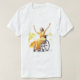 Una hermosa mujer con un vestido amarillo se sienta en su silla de ruedas y baila alegremente