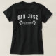 Camiseta negra de mujer para mostrar que estás orgulloso de ser de San Jose. El diseño de esta camiseta presenta "San Jose" en una fuente de losa con "California" y "Estado Dorado" en fuentes de título elegantes con palmeras a ambos lados.