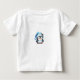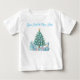 Navidades azules festivos, jersey bebé/niño pequeño con un árbol de Navidad azul, regalos y un niño al lado. Personalice con el cuadro de texto editable de arriba - agregue el nombre o mensaje de vacaciones de su hijo para un lindo conjunto de vacaciones, regalo o foto.