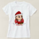 Camiseta de mujer con el ilustracion de una chica feliz y sonriente linda con el pelo castaño largo, lleva disfraz rojo y blanco de Santa Claus y tiene un regalo; con plantilla de texto editable para tu nombre o mensaje, diseño de vacaciones para Navidades
