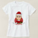 Camiseta de mujer con el ilustracion de una linda y sonriente chica feliz con el pelo rubio corto, lleva traje rojo y blanco de Santa Claus y tiene un regalo; con plantilla de texto editable para tu nombre o mensaje, Navidades diseño de vacaciones con fondo rojo