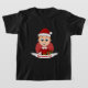 Camiseta para niños con el ilustracion de un lindo sonriente caucásico chico con el pelo corto de jengibre, el niño está usando un disfraz de Papá Noel con un gorra rojo y sosteniendo un regalo, un Navidad de vacaciones diseño personalizado con una plantilla de texto editable para tu nombre o mensaje