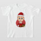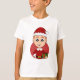 Camiseta para niños con el ilustracion de un lindo sonriente caucásico chico con el pelo corto de jengibre, el niño está usando un disfraz de Papá Noel con un gorra rojo y sosteniendo un regalo; en un círculo rojo sobre un fondo blanco, un Navidad deja de lado el diseño personalizado