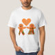 Esta linda camiseta muestra una imagen gráfica de una linda pareja de pan de jengibre. El hombre de pan de jengibre tiene botones verdes y rojos y pantalones con bordes verdes y rojos. La dama del pan de jengibre tiene pestañas de bonito y usa lápiz de labios rojo. Ella tiene una falda roja y verde y encima. Ambos tienen una gran sonrisa. Hay un corazón de pan de jengibre encima de la pareja que muestra su amor por el otro. Hay una escritura blanca dentro del corazón que dice "hecha para el otro". Esto haría un regalo encantador para una pareja en Navidades.