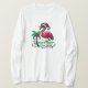 Este ilustracion festivo cuenta con un flamingo rosa brillante vestido con un sombrero de Santa, situado cerca de una palmera decorada con bayas rojas. El suelo está adornado con coloridas lámparas de Navidad que le dan un toque tropical a las obras de arte. El diseño, alegre y vibrante, combina los albornoces de la playa con la alegría de los Navidades.