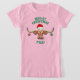 ¡Esta es una camiseta del Chica de Navidades cómicos! Presenta un comico cordero longhorn con un Gorra Navidad y ornamentos... Deseando a todos..."MOO"~OEY NAVIDADES Y'ALL! El artista Kerry Miller creó este original diseño artístico "One of a Kind".