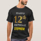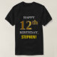 Este sencillo diseño de camisas de color negro con temática de cumpleaños muestra un cálido deseo de cumpleaños como "¡FELIZ 12º CUMPLEAÑOS, STEPHEN!" en la parte delantera, en negrita. El número de cumpleaños tiene un aspecto de color falso/imitación dorado. El nombre del frente puede ser personalizado. Una camisa como esta podría ser divertida de usar en una fiesta de cumpleaños que se celebra para alguien que está celebrando su duodécimo cumpleaños. [~Z0000318]