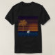 A sleek silver cat sits quietly on a blue grid, gazing at a glowing neon palm tree and warm horizon in this minimalist synthwave nightscape.