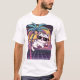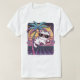 This design shows a relaxed vaporwave cat in pixel sunglasses chilling on a neon palm above a retro 80s grid and glowing sunset, perfect for fans of synthwave, Miami Vice colors, and tumblr aesthetic art.