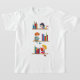 Niños sentados en estanterías leyendo libros. Este diseño parece realmente efectivo en esta camiseta de Chicas
