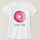 Una camiseta humorística con un juego de palabras con un donut que dice: "No me importa". Con un delicioso ilustracion de un donut glaseado rosado con rociadores coloridos.