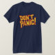 Camiseta de eslogan tipográfico con texto amarillo brillante y rojo. Lecturas: ¡No te asustes! ¡Ideal creado a partir del pánico! Diseño de texto de Sarah Trett.