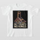 This bold, graphic design features a stark illustration of a wooden guillotine set against a black background. At the base of the structure, two ornate crowns—one large and elaborate, the other smaller—lie discarded and broken amidst scattered rubble and gold coins. Below the imagery, the defiant, distressed-style text reads: "NO TYRANTS NO KINGS."