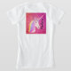 La camiseta con el nombre del Purpurina rosa de la Fantasía Arcoiris de Unicornio está diseñada para los chicas que aman el unicornio mágico y el glam. La camisa blanca tiene una gran cara blanca de unicornio y la cabeza en la parte trasera y tiene el pelo arcoiris y flores encima de la cabeza. El fondo es brillantemente rosa y dorado chispas purpurina color burdo. Personalizado con nombre en escritura de caligrafía negra con letras verticales de la cabeza del unicornio. ¡Es una gran elección para los amantes del unicornio!