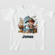 Este encantador diseño de camisetas es perfecto para un niño llamado James que sueña con la alta mar y los cuentos piratas. En el centro, un animado y simpático personalizado niño pirata se pone de pie con valentía y un mapa del tesoro en mano, listo para las aventuras que se abalanzan. Detrás de él hay un gran número '6', que sirve como vela para un barco pirata de madera, sugiriendo que puede ser una celebración de un sexto cumpleaños. Los elementos que acompañan a la gaviota como las gaviotas flaqueantes, los cráneos dispersos y un barril lleno de tesoros añaden al tema lúdico. El nombre "James" aparece en la parte inferior, lo que lo convierte en un tesoro personalizado para cualquier joven explorador.