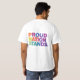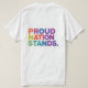 El diseño de la camiseta muestra la frase "Nación Orgullosa se para". Se muestra audazmente en letras vibrantes y multicolores contra un fondo neutral. El diseño es impactante y visualmente atractivo, celebrando el orgullo nacional y la unidad.