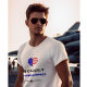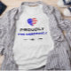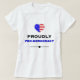 Corazón con un diseño de bandera estadounidense en la parte superior del diseño. "Orgulloso" está escrito debajo de eso en negrita y negro tipo de letra, con "Pro-Democracia" escrito debajo de eso en negritas letras azules. Debajo hay una pequeña estrella negra con líneas a cada lado. Disponible en tamaños masculinos o femeninos y en varios estilos.